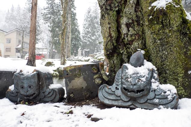 意を決してざくざくと新雪を踏みしめながら池へと向かい、ほとりに並んでいる鬼瓦をしゃがんでよく見ると、その中に3つほど猫の顔が……。