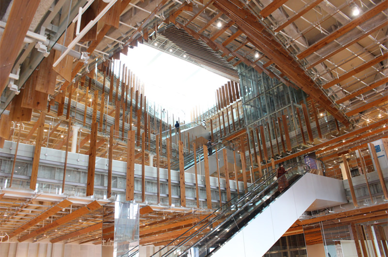 館内も圧巻のこの眺め! シュッとした外観とは対照的に、中は富山県産の杉を使ったルーバー(羽板)がちりばめられており、ぬくもりを感じられる空間。