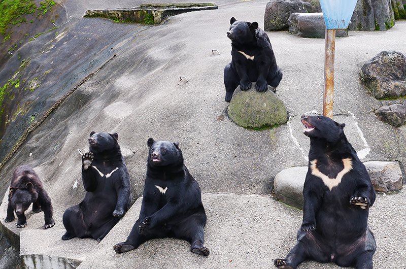 ツキノワグマには餌をあげることができるのだけれど、これがすごい。クマたちが餌をくれとアピールするのだ。話を聞けば、教えたのではなく自然にやるようになるらしい。子グマの頃は照れながらやるが、大きくなると堂々とアピールし出すそうだ。