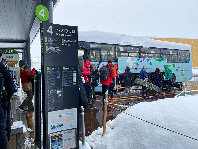 飯山駅で、野沢温泉街までの直通バス「野沢温泉ライナー」に乗り換えます。野沢温泉ライナーは、千曲川口(正面口)を出て左側にある券売機でチケットを購入して、4番乗り場から乗車します。事前予約は不要で、片道600円(税込)です。基本的には、新幹線との接続に合わせてバスに乗り継ぎできますが、時間帯によってはそうでない場合もあるので、あらかじめバスの時刻表を調べておきましょう。