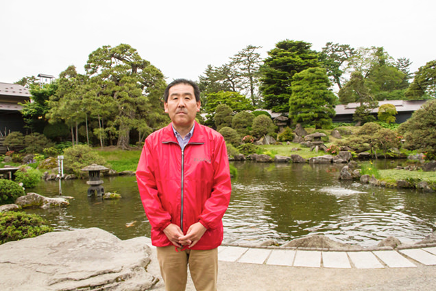 津軽独特の庭園様式「大石武学流」のお庭の前で、村山さんをパチリ