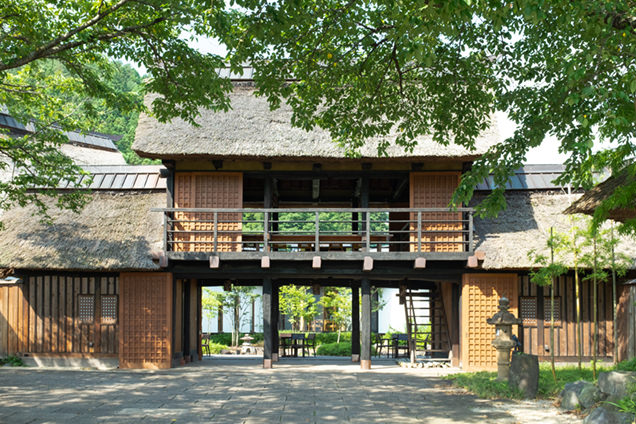 悠湯里庵の敷地内には、七棟のかやぶき家屋が点在しています。これらは、全国の由緒あるかやぶき屋敷・民家を2~3年ほどかけて丁寧に移築してきたものだそうです。玄関横にある「長屋門」も風情のあるたたずまいです。