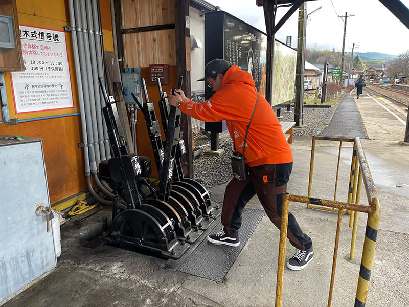 岩村駅に戻り、今度はレアな腕木式信号機体験。
